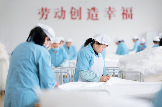 在苏州太湖雪丝绸股份有限公司生产车间内,工人在制作蚕丝被(3月16日摄)。(新华社记者 毛俊/摄)